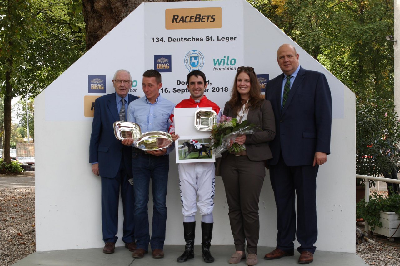 Siegerehrung: v.l.n.r.: Hans-Hugo Miebach (Ehrenpräsident Dortmunder Rennverein e.V.), Stefan Richter (Trainer), Maxim Pecheur (Reiter), Jenny Gödecker (Wilo-Foundation) und Andreas Tiedtke (Präsident Dortmunder Rennverein e.V.). Foto: Marc Rühl