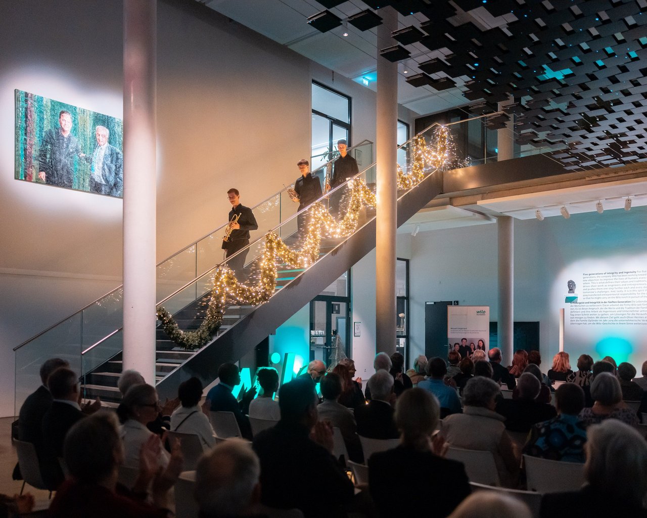 v.l.n.r.: Wolfgang Mertineit (Wilo-Foundation), Sebastian Forstmaier, Johannes Troiber, Bastian Spier, Stifter Dr.-Ing. E. h. Jochen Opländer, Renate Opländer, Oliver Hermes (President & Global CEO der Wilo Group), Karen Ann Bode (Mozart Gesellschaft), David Höltgen (Wilo-Foundation). Foto: Roland Baege
