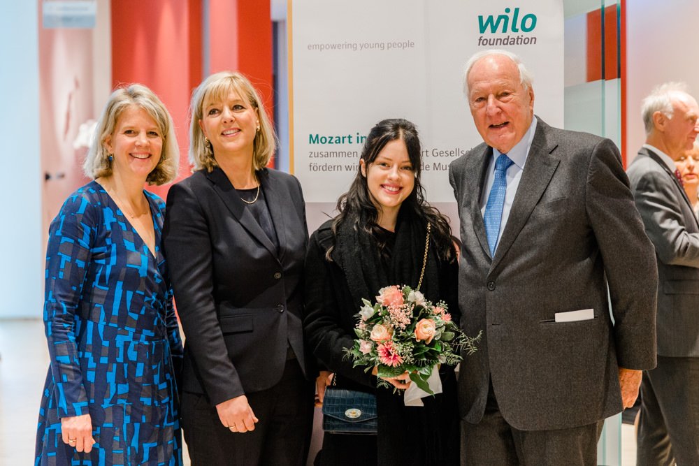 v.l.n.r.: Karen Ann Bode (Mozart Gesellschaft Dortmund), Evi Hoch (Wilo-Foundation), Lara Boschkor und Dr. Jochen Opländer (Wilo-Foundation). Foto: Mozart Gesellschaft Dortmund