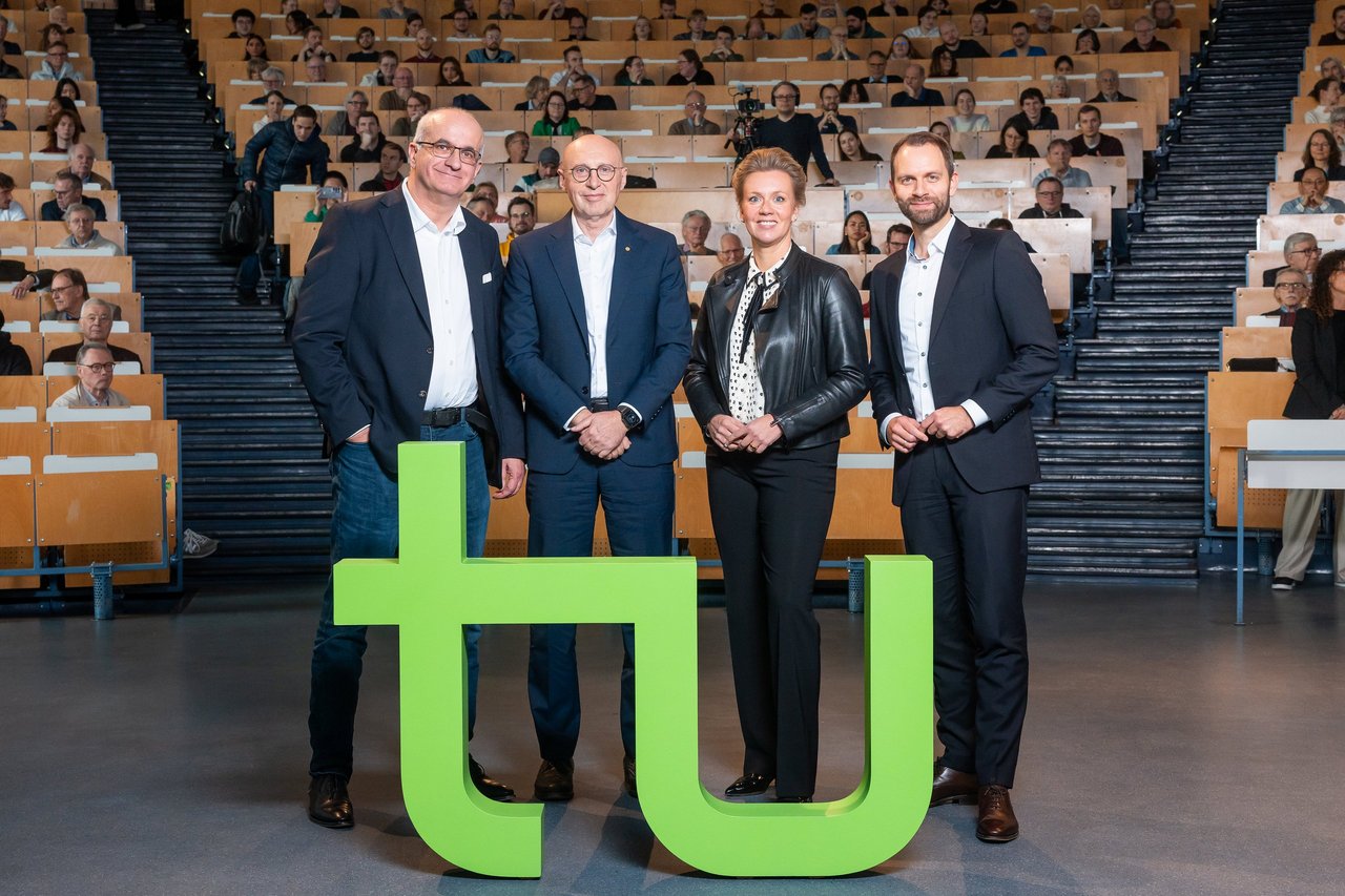 v.l.n.r.: Prof. Dr. Manfred Bayer (Rektor der TU Dortmund), Prof. Stefan Hell, Ina Brandes (Ministerin für Kultur und Wissenschaft des Landes Nordrhein-Westfalen) und David Höltgen (Wilo-Foundation). Foto: TU Dortmund, Credit: Roland Baege