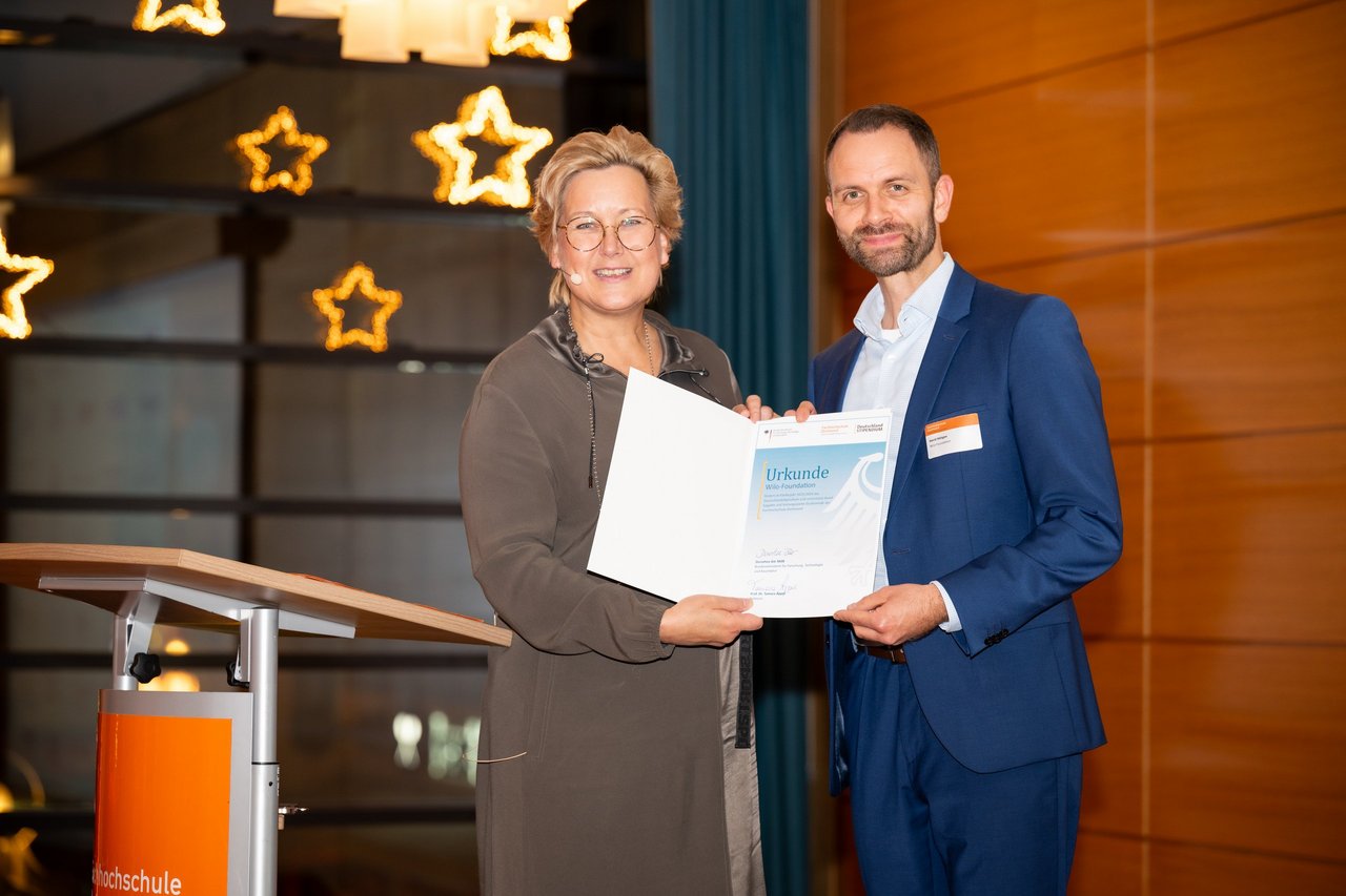 Gruppenbild mit den Stipendiatinnen und Stipendiaten der Wilo-Foundation im Studienjahr 2025/26 gemeinsam mit David Höltgen (Wilo-Foundation, mitte links) und Christina Lorenz (Wilo-Foundation, mitte rechts). Foto: Fachhochschule Dortmund, Credit: Mike Henning
