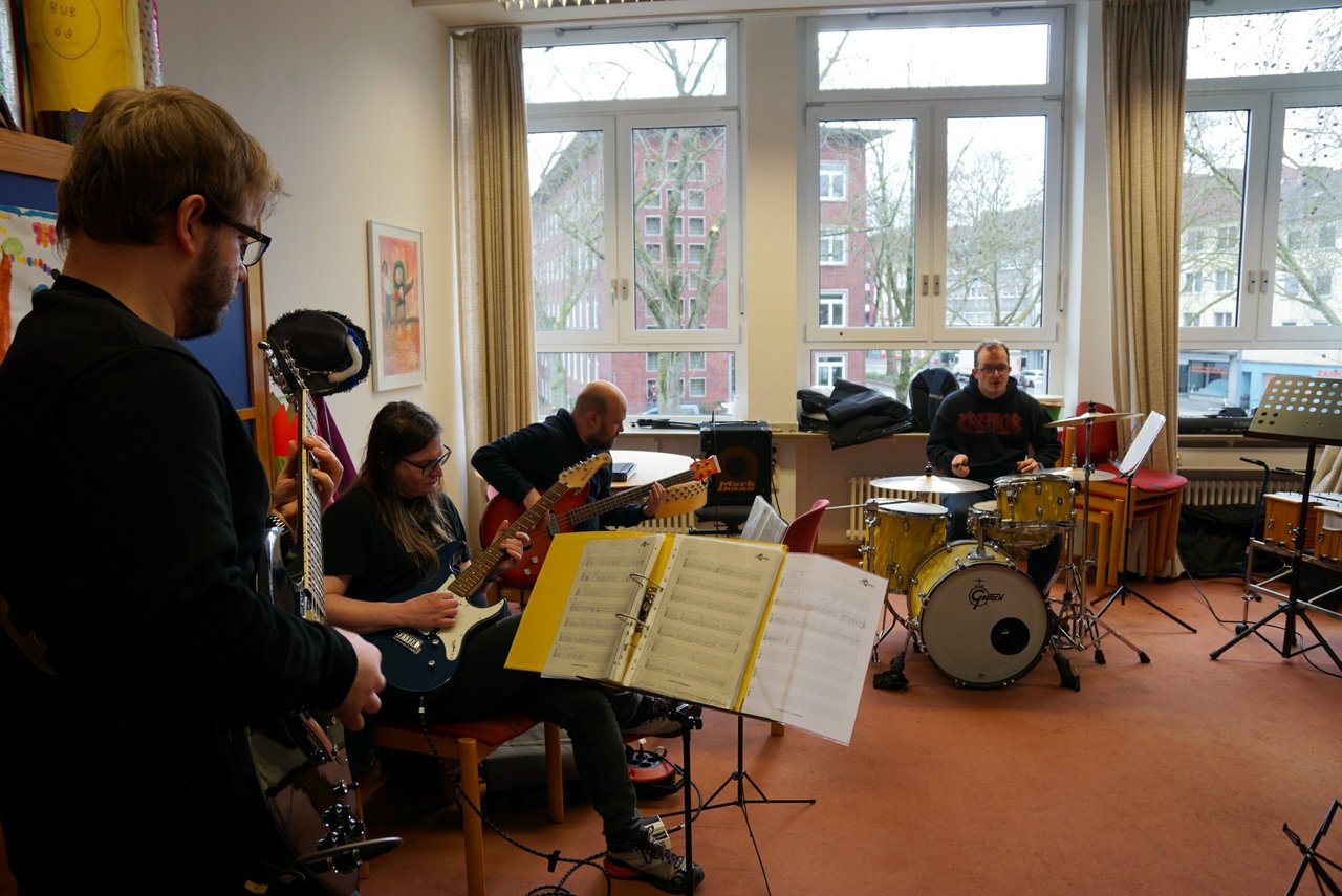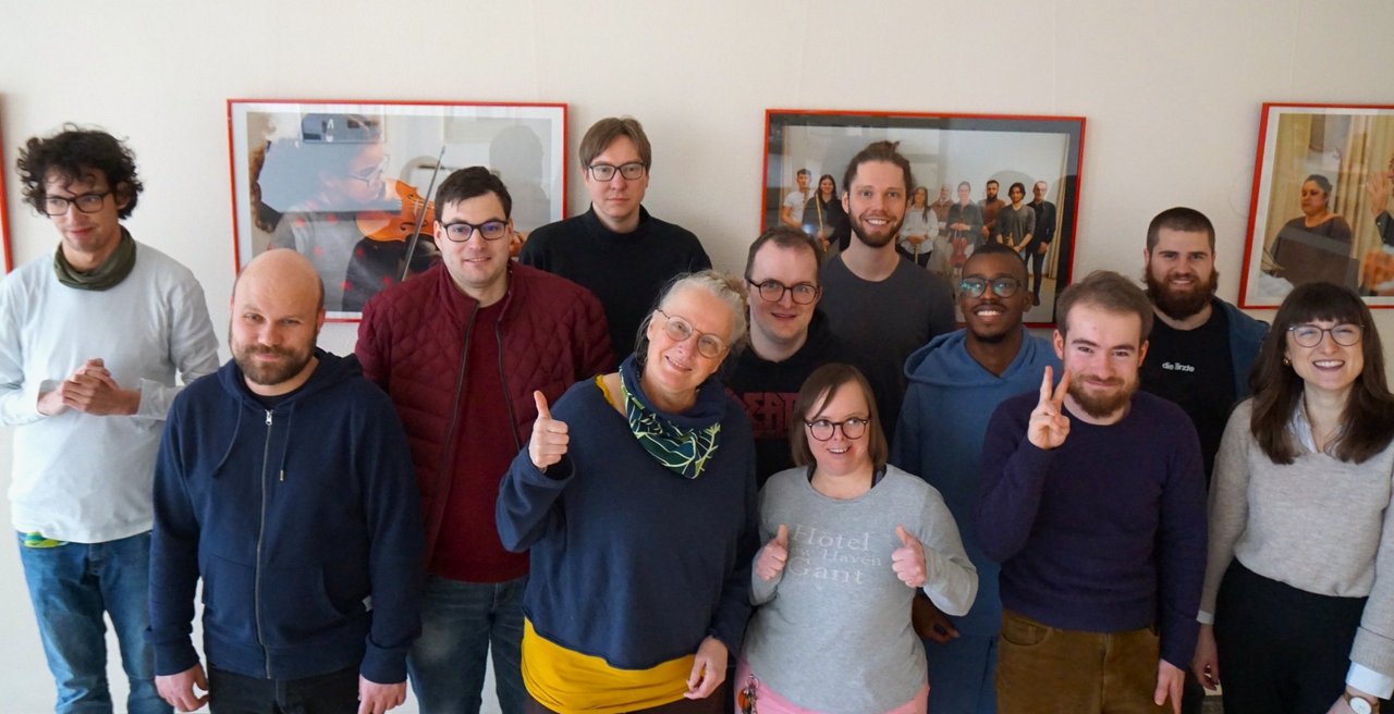 Gruppenbild mit Musikerinnen und Musiker von „Tonstudio 13“ und dem Team von gesamtkunstwerk e.V. beim Probenbesuch von Christina Lorenz (Wilo-Foundation, rechts). Foto: Wilo-Foundation