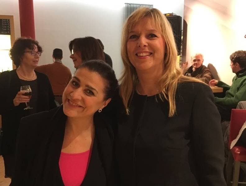 Cecilia Bartoli (li.) wurde vom Förderer Wilo-Foundation, Stiftungsvorstand Evi Hoch (re.), zum großartigen Auftritt beim meet & greet nach der Oper beglückwünscht.
